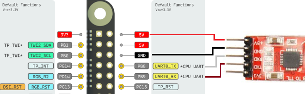 The 5V from the UART goes to either 5V pin on the board and GND goes to GND. Both TX and RX swap between the board and UART. The RX on UART goes to TX on the board, and TX on UART goes to RX on the board. Once