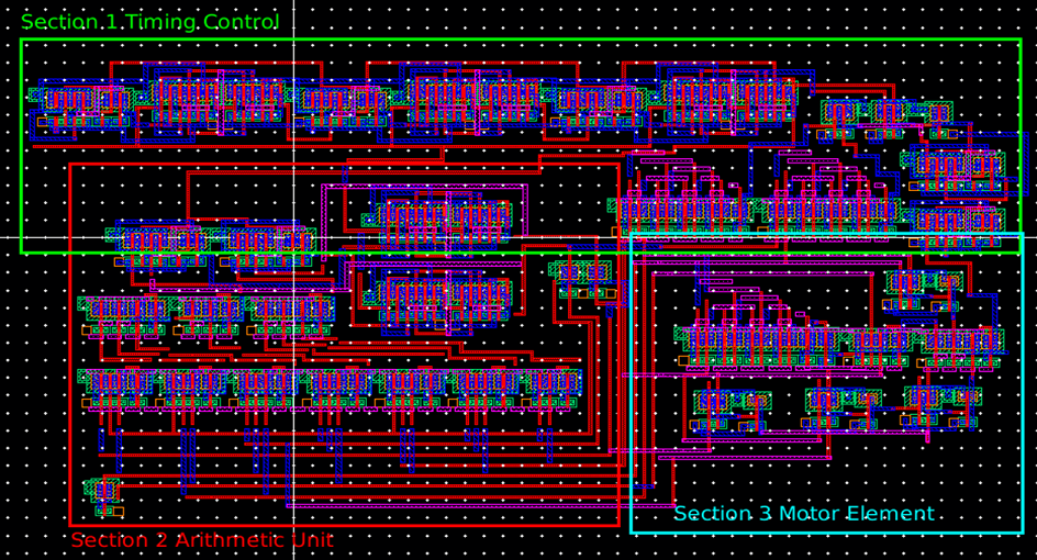 Below is the high level schematic design which shows the VLSI implementation as logic gates. Unfortunately I don't have any of the original files from Virtuoso.